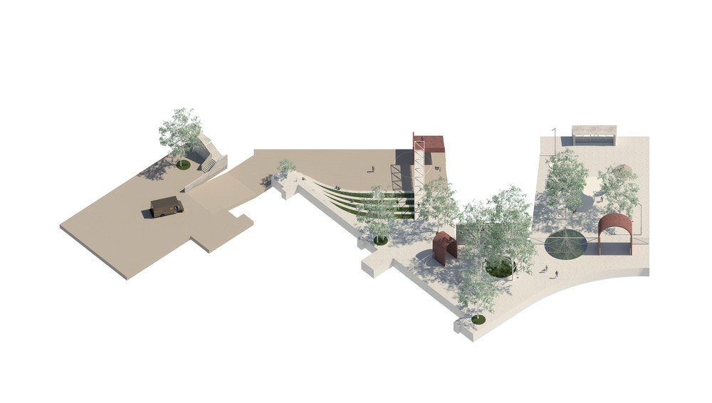 En ce qui concerne le rapport à l’ilot, le projet de Mamout + Bast propose une action empreinte d’optimisme qui consiste à supprimer toute limite entre le square et l’école au profit d’un lieu unique. Les deux espaces d’origine, parvis et triangle sont unifiés en un seul espace public au centre duquel le théâtre est complètement redéfini en un lieu transparent. Si la qualité intrinsèque de l’espace est indéniable, ce dispositif soulève la question de sa gestion et de sa sécurisation et d’autre part semble apporter une relative redondance qui interroge à l’égard du projet de réaménagement de l’ilot et des autres espaces publics existants. Pour parvenir à cette radicalité du propos, les locaux d’accompagnement du théâtre sont logés dans le socle, ce qui conduit à supprimer les prises de lumière d’une des façades de l’école maternelle dont la qualité s’en trouve diminuée.
